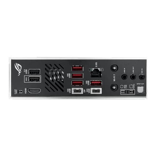 | Back Panel I/O Ports | 1 x USB 20Gbps port(s) 5 x USB 10Gbps port(s) (4 x Type-A + 1 x USB Type-C® with DP Alt mode) 2 x USB 2.0 port(s) (2 x Type-A) 1 x HDMI™ port 1 x Wi-Fi module 1 x Intel® 2.5Gb Ethernet port 3 x Audio jacks 1 x Optical S/PDIF out port 1 x BIOS FlashBack™ button 1 x Clear CMOS button 1 x FlexKey button |