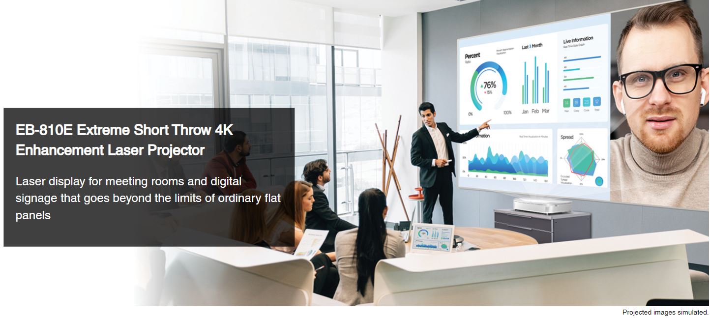 EB-810E’s extreme short throw lens allows discreet positioning close to the wall, enabling presenters free access without casting shadows. The projector also comes with versatile wired and wireless connectivity options, including Miracast™ screen mirroring, ensure effortless, multi-device support for content sharing.