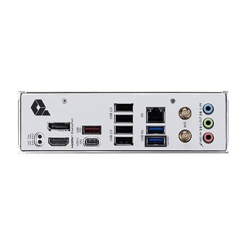 | Back Panel I/O Ports | Clear CMOS Button DisplayPort USB 10Gbps Type-A USB 2.0 5G LAN Wi-Fi / Bluetooth Audio connectors Flash BIOS Button HDMI USB 10Gbps Type-C USB 5Gbps Type-A |