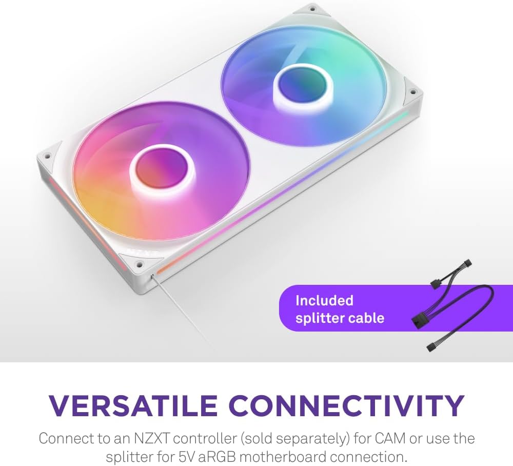 - Simply connect a single cable to an NZXT controller (sold separately) for lighting and speed control via NZXT CAM software. Or, connect to any motherboard’s 5V ARGB header using the included splitter cable.