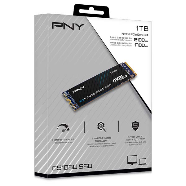 The PNY CS1030 M.2 NVMe SSD is an excellent choice for an NVMe upgrade from a SATA based solid state drive (SSD) or traditional hard drive in an NVMe enabled desktop or laptop computer. The CS1030 drive is designed to be an upgrade from conventional SATA based storage to take advantage of the high bandwidth of the NVMe interface to help realize faster boot times, quicker application launches, and better overall system performance. Do more in less time with NVMe; boot up, power down, and load applications up to 4 times faster than with SATA based SSD’s. With no moving parts, the PNY CS1030 M.2 NVMe SSD is highly durable, less likely to fail, and supports a 5-Year Limited Warranty or TBW.