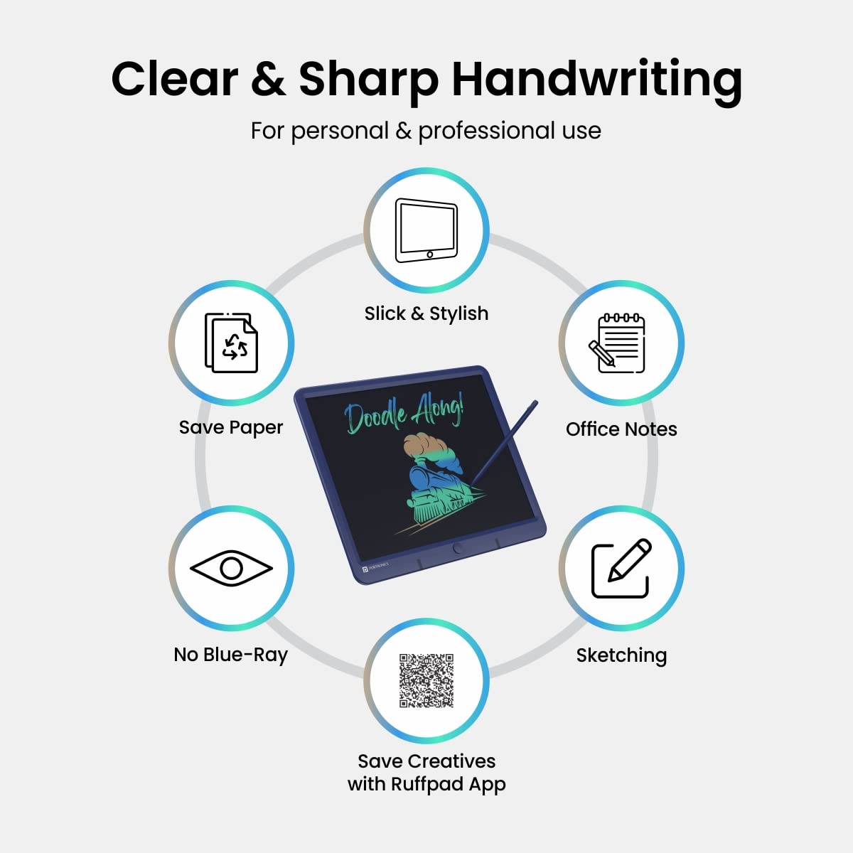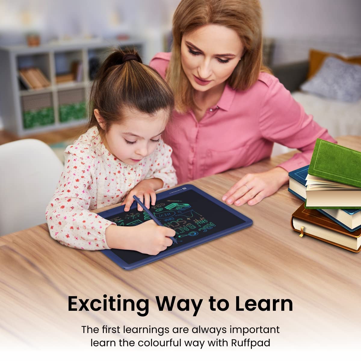 - [YOUR SMART & SLIMMEST NOTEBOOK] : A Sleek body with 6.6mm thickness making the Ruffpad 15M your slick re-writable digital slate for kids. Feared of the jotted notes getting erased? The LCD writing pad for kids features a lock feature that keeps your points safe on the screen. Want to write new notes? Just press the one-time delete button so that you can jot down new notes.